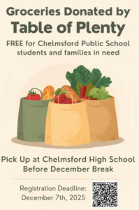 The Chelmsford Public School District Social Work team has partnered with Table of Plenty to offer free groceries to families in need ahead of December break. Register by 12/7/2025. (Multilanguage links)