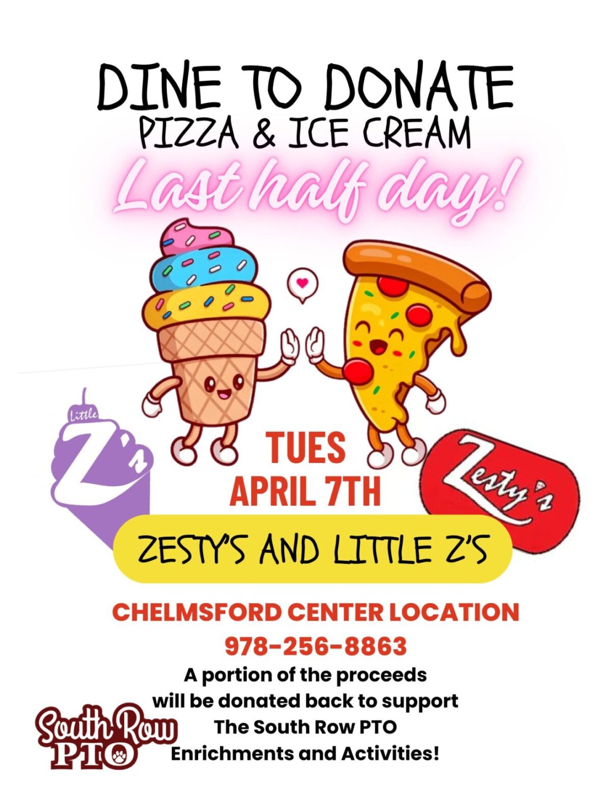 Dine to donate at Zestys for our last half day of the school year. Lunch, Dinner and Ice Cream!